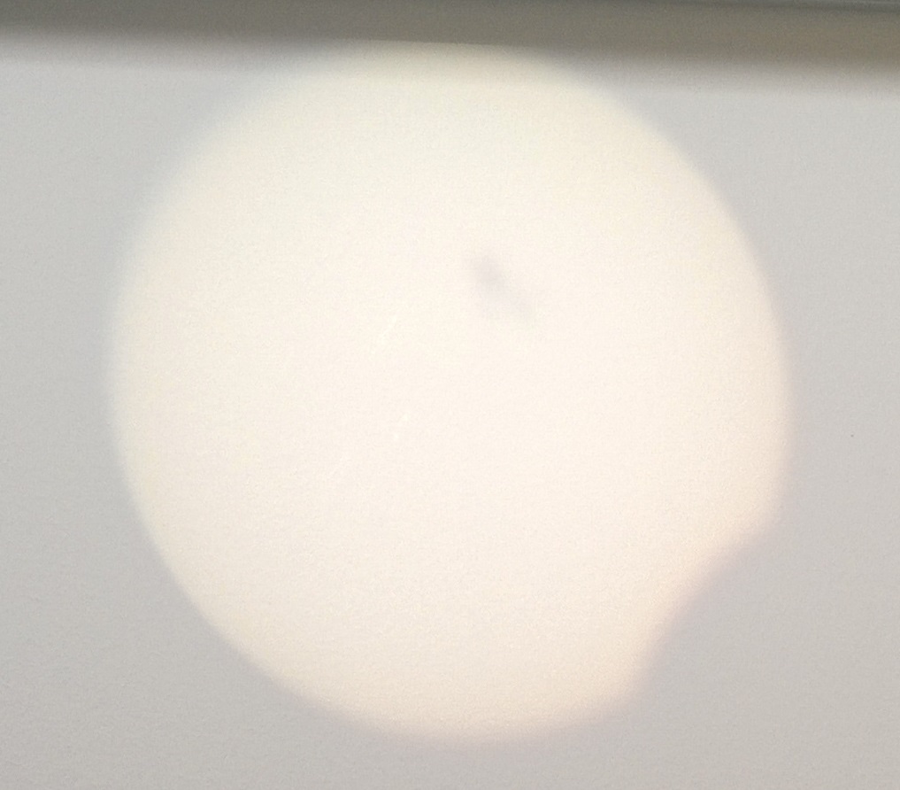 I’ve put a pair of binoculars facing the sun on my desk on a notebook, masked one of the lenses with a post-it note, and propped it up with a box of business cards. By rotating the notebook I can follow the sun, and by rotating the corner of the box on the left side and keeping the corner on the right side fixed, I can very slightly adjust the height. Since the sun moves left-to-right much faster than up-and-down at 1:40 in the afternoon, that’s handy. I then focus the image on the wall.