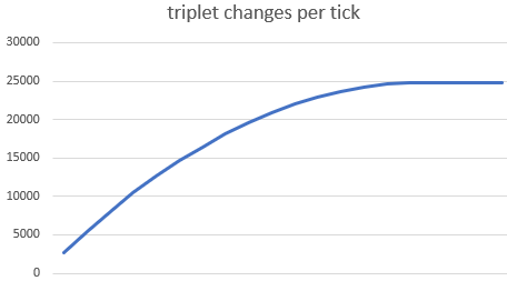 What about memory? In this prototype implementation we have 65536 cells, and we are storing two generations. How many bits are we using? (We will ignore fixed costs such as the lookup tables.) If we suppose that references are 8 bytes then: