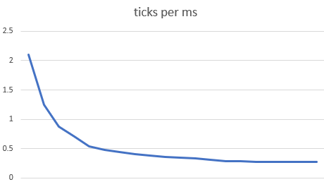 What do you think the time performance of this initial prototype is? Remember, this is a fully naïve implementation in the sense that we are not doing any kind of change tracking, we are not identifying “all dead” Quad4s and skipping them, and so on. We have a 256×256 grid and we are computing the next generation by looking at every one of those cells; the optimization we have with our lookup table is that we compute the results “four at a time” via lookup to get a 1-quad rather than by counting neighbours.