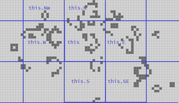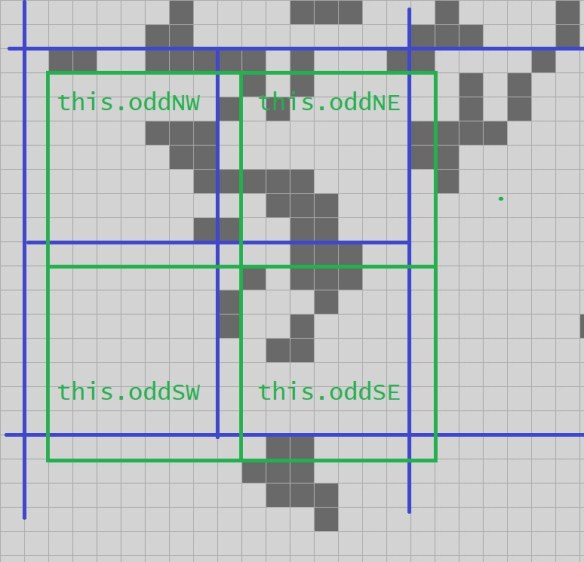 So far I’ve given you code for Quad2, Quad3, Quad4, the stepping algorithm for a Quad4 on even and odd cycles, and a lookup table to step even and odd Quad2s, so I won’t repeat that. What we need now is code to hold the whole thing together. I’ll omit a bunch of the code that does not relate directly to the task at hand, such as how we draw the screen, how we handle creating the initial pattern, and so on; see the source code link above if those algorithms interest you.