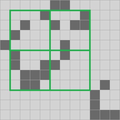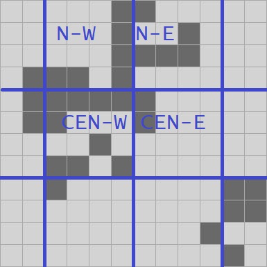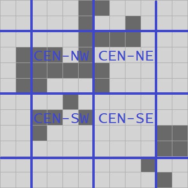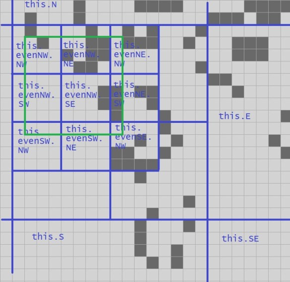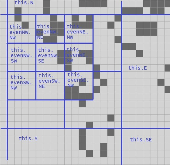 For our proto-QuickLife I’m just going to go with the same thing we saw in all of our previous fixed-size implementations: I’ll make an 8-quad. We have a 4-quad data structure in hand, and so we’ll need a 16 x 16 grid of 4-quads.