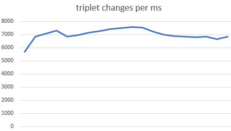 What do you think the time performance of this initial prototype is? Remember, this is a fully naïve implementation in the sense that we are not doing any kind of change tracking, we are not identifying “all dead” Quad4s and skipping them, and so on. We have a 256×256 grid and we are computing the next generation by looking at every one of those cells; the optimization we have with our lookup table is that we compute the results “four at a time” via lookup to get a 1-quad rather than by counting neighbours.