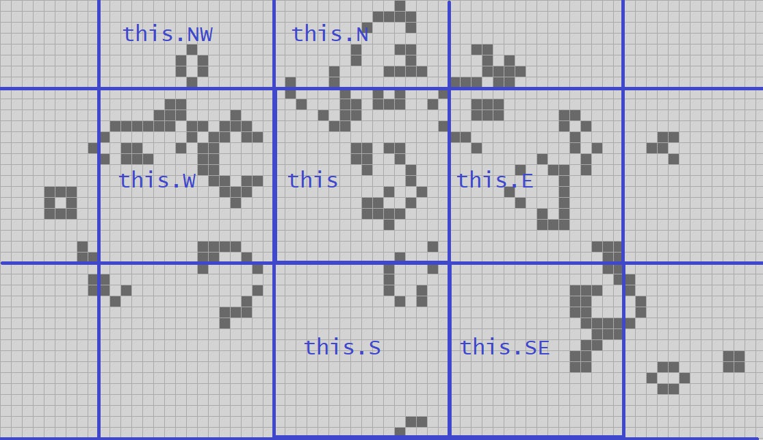 So far I’ve given you code for Quad2, Quad3, Quad4, the stepping algorithm for a Quad4 on even and odd cycles, and a lookup table to step even and odd Quad2s, so I won’t repeat that. What we need now is code to hold the whole thing together. I’ll omit a bunch of the code that does not relate directly to the task at hand, such as how we draw the screen, how we handle creating the initial pattern, and so on; see the source code link above if those algorithms interest you.