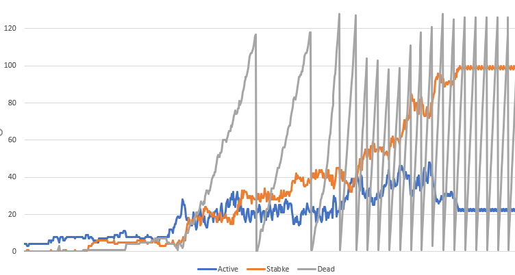 - The stable count steadily grows as the active region is a smaller and smaller percentage of the total. Around the 5000th generation everything except the escaped gliders is stable, and we end up with around 100 stable Quad4s and 20 active Quad4s for the gliders.
