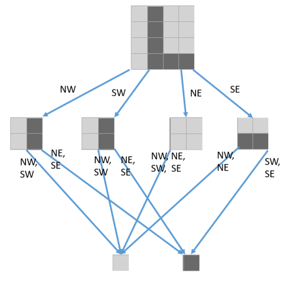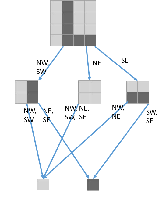 And finally: how do we expand into new space? That is super easy, barely an inconvenience. If we have just processed an active Quad4 on the even cycle then we’ve created a new odd Quad4 and in doing so we’ve set the activity bits for the 16 regions in the odd Quad4. If the south 16×2 edge of the odd Quad4 is active then the Quad4 to the south must be activated, and so on: