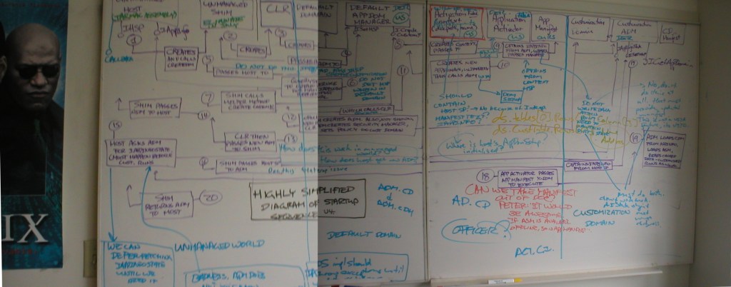 Earlier this week I was looking for an old photo, and while browsing I came across a photo I took of my whiteboard in my office at Microsoft in 2004. Or rather, it was two photos; I’ve crudely stitched them together. Click on the image for a larger version.