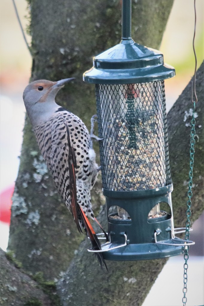 Northern flicker — the most common woodpecker in the Pacific Northwest; we typically see the “red-shafted” variety which is in fact orange-shafted. This is a female; the male has a red spot on the face.