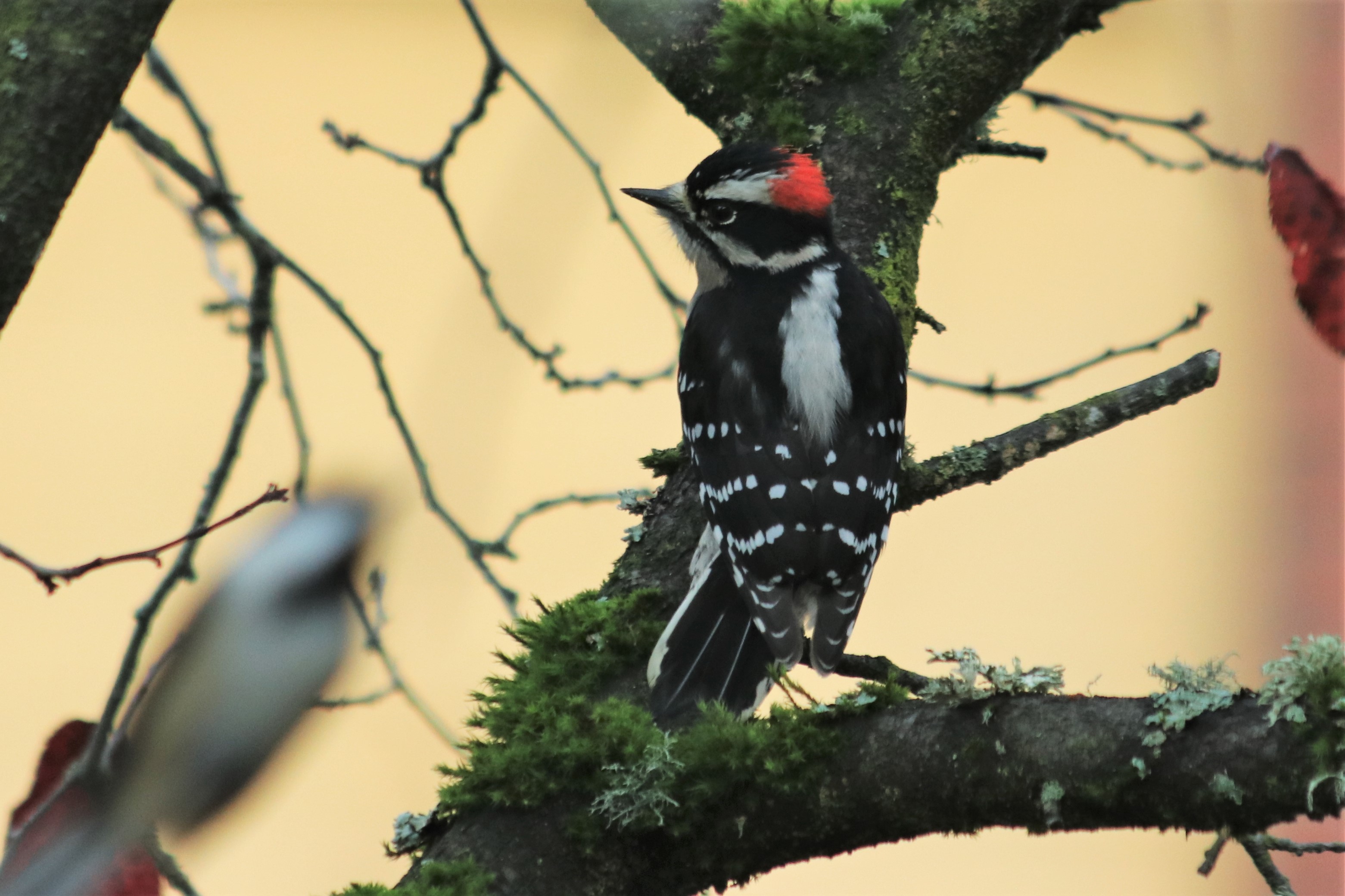 Downy woodpecker — easily confused with the hairy woodpecker, which I have not yet seen in my yard. The male has a red cap. The smallest North American woodpecker.